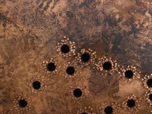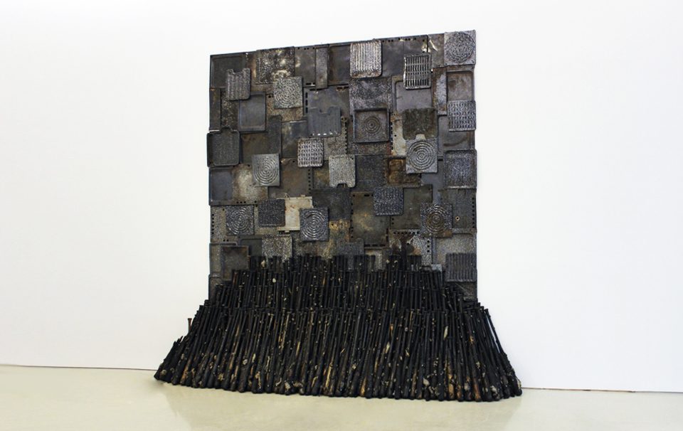 1. Nari Ward, Iron Heavens, 1995. Installation of oven pans, ironed cotton and charred wooden bats. Photo courtesy of the artist and Lehmann Maupin.