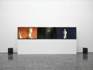 While ascending the stairs to the upstairs gallery platform, the viewer’s perception of the works on display becomes unbalanced. The structure of the building evolves into a dominant factor within the situating of Annegret Soltau’s earlier works. Three distinct light sources interject and layer their spheres of influence upon the small room. A series of three light boxes Im Kaleidoskop (I) (II) (III) (1992), made up of black and white photos of Annegret Soltau, are fractured and reassemble a kaleidoscope as it is transmitted through luminous pastel shades. On the opposing wall, three black and white self-portrait photographs, all punctured with small pins, reside in a glass cabinet. The dusty haze of the ceiling light and the clinical intensity from florescent lights in the lower gallery creep over the surfaces of the photographs. The subtle forms of the pins scars the surfaces instilling an intricate linear web. Annegret Soltau’s earlier work is more experimental in terms of medium and outcome. Fixated purely on her own body, the lighting and architecture become metaphorical of a birthing point and, like a nurtured child, has grown to become the more refined and confident work in the lower gallery.