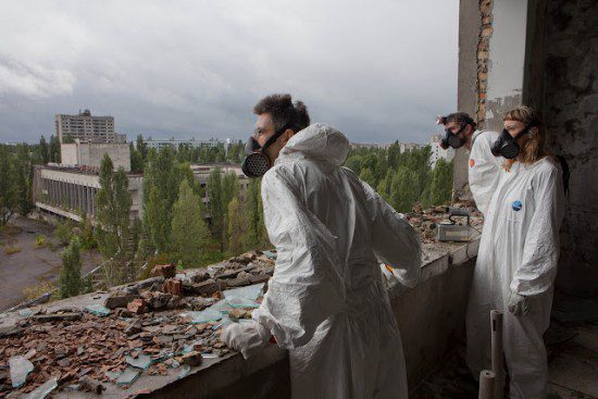 Their first solo show in London is a compelling cacophony of connected facts and fictions where screams echo through the space, the walls are hung with ugly wallpaper and painted blue, green and red; defunt computer monitors and brightly coloured cables snake across the floor, images are suspended from the ceiling; half a museum vitrine emerges from a wall, and in a corner, a replication of Chernobyl’s derelict cinema…there’s a lot going on in this exhibit.