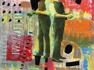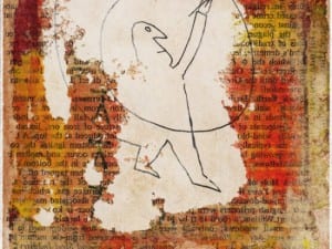 Simon Kirk free associates images and text to create playful abstractions. He is interested in the ambiguous subjective ‘hidden’ narrative where the ‘story’ remains oblique or partial. The work is multidirectional and open ended. Meaning is inherent but impossible to pin down precisely. The work is primarily layers of painting combined with collaged elements. However, he also uses the decollage technique – cutting, tearing or sanding away parts of the built up surface image to reveal layers below.