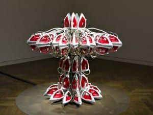 The pieces on display are varied in media and all portray this irreverent attitude toward human nature and its foibles. His Manifesto (2008) presents a circular projection suspended above the floor, built around the words “Hypocritical, Ironic, and Do Not Give a ****”. There is also a new video on display, made by Mosquito in collaboration with Spanish artist Vic Pereiró.