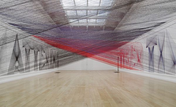 For her latest London show, Pae White has created a hypnotic maze of black, red, blue and purple threads which reach from and terminate into the walls of South London Gallery – as seemingly endless and bewildering as the sleepless nights that conceived it. White’s bout of insomnia began when she stopped running, and this blur of colour and text reflects upon the thoughts which possessed her addled mind during this period.