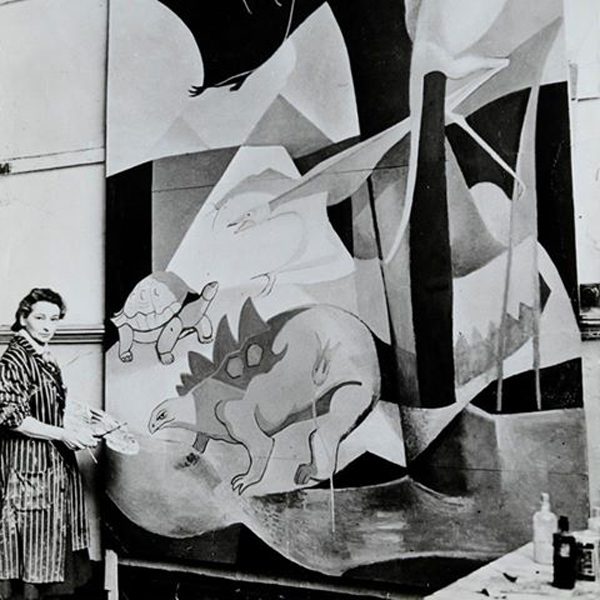 1. Photograph of Dorothy Annan working on her mural, The History of Flight, for Hatfield Junior School, Hertfordshire, 1940s. Courtesy of the Estate of Dorothy Annan and Trevor Tennant/Leeds Museums & Galleries (Henry Moore Institute Archive).