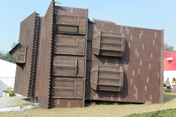 The Art Projects strand consisted of indoor and outdoor works specifically curated by Shahane. Much like the rigor of the works at the concurrent Kochi Muziris Biennale in south India, these artists addressed pressing contemporary issues with a new and forceful tenacity. T. V. Santhosh’s The Threshold into a Dream, of a precariously tilted wooden replica of the Victoria Terminus railway station in Mumbai that was bombed by Islamic militants in 2008 is fitted with numerous digital clocks that recall the exact time the bombs went off. Veer Munshi’s Serenity of Desolation, pays homage to homes and lives lost in the recent flood in Kashmir through his barebones house and wall filled with sepia toned portraits of the missing. A four day painting-as-performance collaboration between artists Dhruvi Acharya and Chitra Ganesh combined Acharya’s odd cartoon like women with Ganesh’s mythological female figures drawn from Indian comic series to produce an alluring figurative painting of bright colours and imaginative forms.