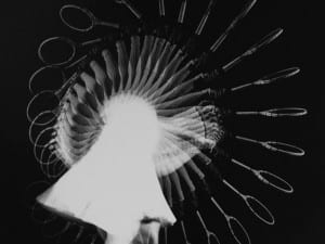 All sculptures (the so-called stabiles as opposed to the earlier mobiles) stand on elongated and attenuated legs, supporting heavy and voluminous geometrical bodies. The underlying kinesis of his creatures is engulfed in his Teddy Boy and Girl (1955), one of the works responsible for engaging the Biennale prize in 1956. Here, the male and the female figures are portrayed as two monumental entities in motion -a rectangle and triangle in dialogue- balancing on stilts. The representation of this particular male figure is reminiscent of the egg case of a skate, echoing Chadwick’s inspiration from the natural world.