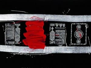 The second room further expands on the myth: showcasing an ephemeral charcoal wall drawing, Medea as Mutant (1993/2014), 12 panel digital prints on archival Hahnemühle paper depicting the myth in its entirety, and three “robes” that are reverse paintings of watercolour and enamel on Mylar and mark pivotal turning points in Euripedes’ script of Medea – entitled The Bridal Gown (1993), The Robe of Vengeance (1993) and The Alchemist’s Robe (1993). An audio soundtrack defines the mood, and text on the wall acts as a signifier of Malani’s position: “If more attention were paid to the female thought process, perhaps we might reach something called progress.”