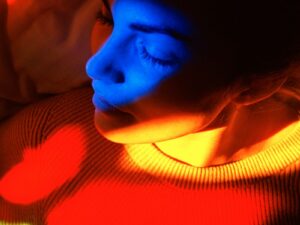 Upstairs, a small attic room is the perfect venue for the work of visual artist Jonathan Hayter. In his light sculpture, Worlds in collision; Transit in the Attic he explores the themes of change and transition in a colourful projection of dark and light suspended shapes, the patterns and shadows dance around the walls in a quiet harmony reminiscent of the first abstract artist, Wassily Kandinsky.