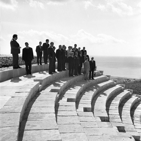 Christodoulos Panayiotou’s Invention of Antiquity (2012) presents an array of photographs culled from the archives of the Press and Information Office in Nicosia. In these photographs- likely commissioned by the Cypriot state as propaganda- various officials are photographed in and around the archaeological ruins of ancient amphitheaters in Cyprus at a crucial turning point in the state’s history. After gaining independence from Britain in 1960, the staged photographs demonstrate an effort on the state’s part to align the history of the emerging state with that of Athens’ illustrious classical past.