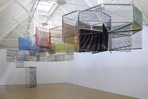 Inhabiting the entirety of the remaining room, the Piper Gallery, a dominating system of connected blinds suspends itself from the ceiling. The level at which this hexagonal-like work is observed allows visitors to monitor the influence that movement has on its horizontal slats. Whilst the impressive sculpture is ambled around, the ladders of the Venetian blinds flickers, causing a collective scrolling between the myriad of compartments. Beneath the creation stands a smaller and more interactive arrangement of blinds which demonstrates a corresponding retort to eye level and motion.
