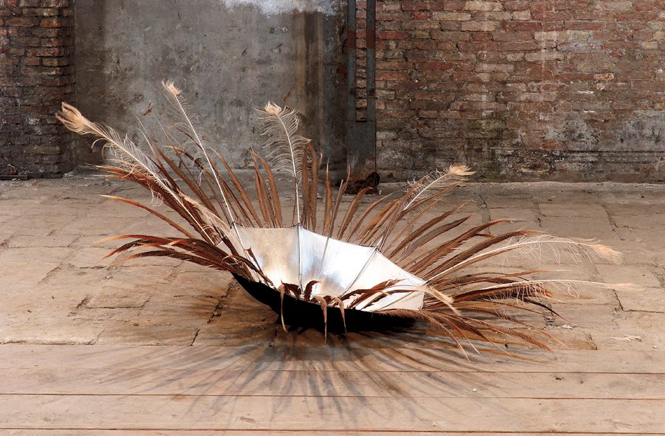 This dynamism is inherent in the casual materials of his sculptures; feathers, pieces of rubber or plastic, a stray cymbal, a set of shark jaws, and a discarded empty can of vegetable oil all take on a new grace and status as objects as they are reconfigured into sculptural form by Cruzvillegas. The Optimistic Failure (2011), a suspended sculpture reminiscent of a chandelier in shape but closer in artistic comparison to an Alexander Calder mobile, is composed of representations of shrunken heads (tsantsas) made with various materials (coconuts, artificial hair, dung etc). The heads, which were traditionally used by tribes in the Amazon for ritual and trophic purposes, are fascinating in both their inherent anthropological allusions to the tribes by which they were used, and in their very material composition. The accumulation of disparate objects and forms into a cohesive, usable form is the very reality of his sculptures: the unusable becomes usable. His family home is exemplary of this and Cruzvillegas states in Autoconstrucción: The Book (2009): “The references that arise from observing the house are also transformed, in an equally unstable way, into obstacles, debris, constraints, leaps and jumps, tremors and unevenness, falling materials, ricochets, cracks, and disappearances that appeal to what is local in the form of a somatic consciousness of the immediate, the urgent, of a physical presence in time and space, multiple and simultaneous.” Cruzvillegas actively searches for and accumulates materials, not always with a specific intent in mind as most of the materials find themselves back in his studio for variable amounts of time. Once found by him they tend to lose their utility, valued as what Kim identifies as “raw material” and for their inert energy.