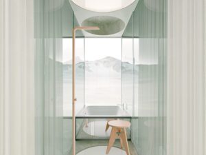 Expansive – the final section – investigates less obvious yet fundamental elements like air, light and water. Whilst “light is not something most of us immediately recognise as a material,” Solanki states, some of the most amazing concepts in the book utilise it in its own right, addressing the ways it is perceived and experienced. This is something that has often been investigated in visual arts – through the likes of James Turrell’s Skyspaces and Olafur Eliasson’s various public projects – but in this case, light is considered for its impact on wellbeing. Rotterdam-based Sabine Marcelis, who runs a studio for installation and object design, manipulates light paths to affect surrounding spaces. VOIE, for example, is a collection of cast-polyester-resin pieces in various shapes and wide spectrum of colours, which are lit through. The resin’s properties allow the light to diffuse in many ways, thus creating extraordinary visual effects, which enhance the various hues. It seems to confirm the designer’s statement, which reads: “Forever in search of magical moments within manufacturing processes to create unexpected experiences.” Not only can the final result be adjusted to the needs of the space, but also Marcelis’ designs work to co-create it, as light circulates across the space and is subsequently reflected in multiple directions.