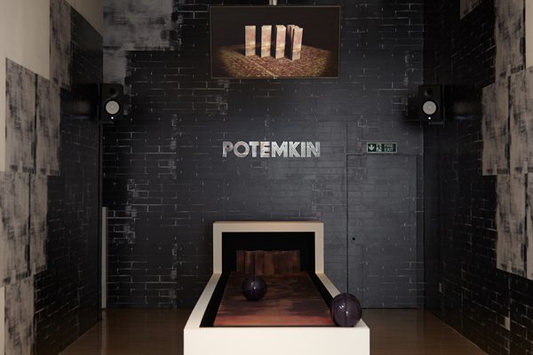Craig Mulholland’s suite of drawings set in the gallery’s vestibule in silicon carbide and ink Illegitimi Non Carborundum proclaims – in glitter – an steadfast “don’t let the bastards grind you down”. While upstairs his Potemkin Funktion installation sees a ten-pin bowling alley recreated with a 3D computer animation, a video projection and heavy bass soundtrack repeating the word “function”. His works melds objects, print and performance with a scientific methodology that create philosophical refrains on queer theory and subversive notes on Marxism and ontology. Mulholland’s rock and roll aesthetic embraces the deceptive and nonconformist. These works explore politics, policies and economics constructed as frontages that are built to impress, distort and deceive.