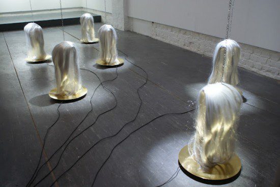 JO: Radotage is a piece that brings the obsession of being in a loop, all those wigs turning endlessly, scratching the surface of a cymbal. It creates a space for listening that is both minimalist sound and repetitive visually creating a worrying strangeness.