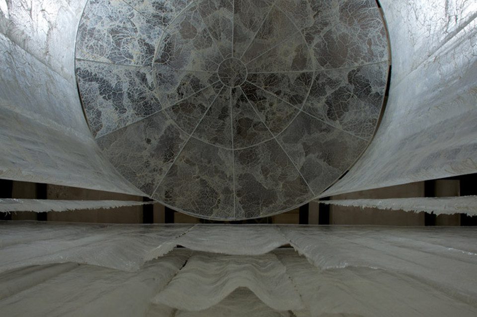 Spanning the disciplines of sculpture, installation, video, photography and architectural intervention, Hadzi-Vasileva’s wide-ranging practice incorporates ephemeral, perishable and precious materials; often transforming mundane surfaces into intricate and grandiose environments that reflect upon a series of historic, geographic and cultural contexts. Haruspex (2015), which has its UK premiere at Djanogly Gallery, was originally commissioned for the Vatican Pavilion at the 56th Venice Biennale and responds to a key scriptural text. Constructed from meat industry waste products, the installation’s central point, a chalice-like form, is made from a cow’s stomach.