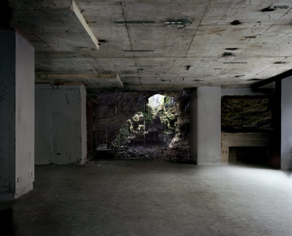 Alongside them, Noémie Goudal stages landscapes that trouble perception. Her work often reveals the constructed nature of what we take to be natural, creating environments that feel at once geological and theatrical. Malik Jama recalls being captivated by her interventions: “I saw art that looked like a cave in a car park by Noémie Goudal and I liked her waterfall too.” This joy in discovery is mirrored in Jama’s own practice of projection mapping and photography, where the everyday is reframed as something wondrous. The echo between Goudal’s illusions and Jama’s digital transformations speaks to the show’s central motif of the cave—both literal and metaphorical – as a site where new understandings emerge.