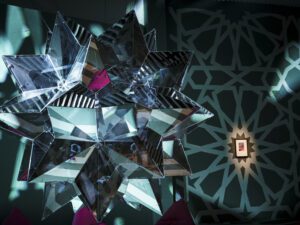 Colour also constructs the flat, minimalist forms and compositions that are so central to Heck’s oeuvre. In the Without a Faceseries (2018), the eye narrows in on oversized globular hats and sculptural garments by Giorgio Armani and Junya Watanabe, in blocks of both monochromatic colour and pattern. In these and other examples, the body is effaced as garment embeds itself in the wider pictorial whole. In two 2015 images from Harper’s Bazaar, Queen of Heartsand Florals, Heck manipulates his image in digital postproduction and applies red and black paint splotches and red and pink petals respectively, so that garments’ patterns appears to spill out onto the white ground. Conversely, the dressed body camouflages against nature’s immensity, or abundance in his epic photographs set in lush colourful landscapes. In both his studio and on-site photographs, Heck fabricates dreamlike worlds, in which onlookers may insert themselves through fashion.