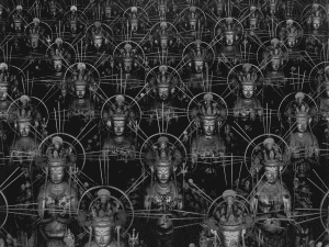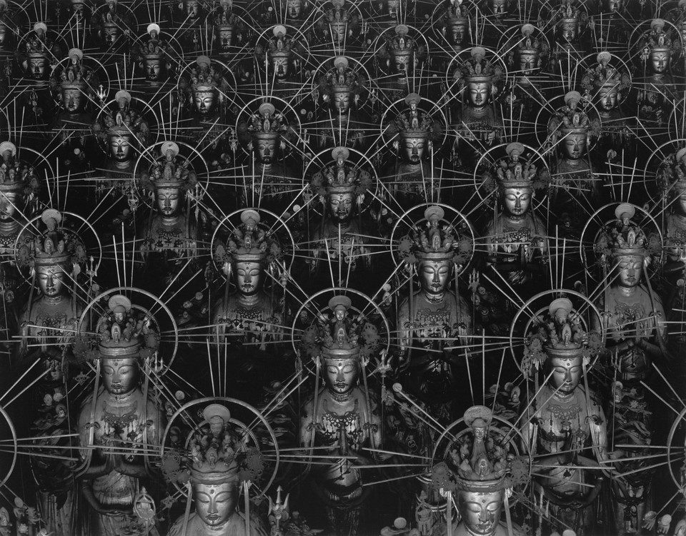 Sugimoto (who was born in Tokyo in 1948) deviated from his usual process of continuously working on and expanding a series over years or decades for this sequence, instead finalising a closed set of images over the course of ten days. The subject of the series is the thousand statues installed in Kyoto’s Sanjῡsangen-dō, or Hall of Thirty-Three Bays, a temple dating from 1266 AD. Through visual repetition, Sugimoto refers to the religious and historical concepts that guided the original creation of the statues. Simulating the reproductions of the one-thousand-armed bodhisattva of compassion known as Senju Kannon, Sugimoto’s images signify the Buddhist practice of replicating manifestations of a deity in order to achieve spiritual merit. The compositional structure of the photographs and the effects of light creating the impression of a limitless expanse – or sea – of figures in space.
