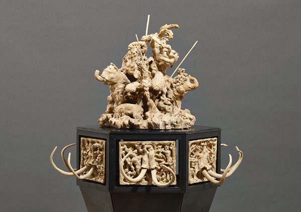 A series of paintings takes hunting scenes as their focal point: based upon old masters’ works such as those by Peter Paul Rubens, Wilson’s works depict strange scenes where animals such as lions and tigers have been trained to hunt other beasts. The images are dark, blurred, detail removed in the dramatic and fast-pace of the chase; the climax of the kill is captured in flashes of black and red.