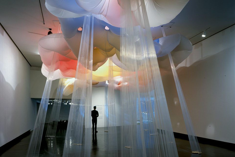 However, there is also something profoundly unnatural about the piece. The materials do not themselves look natural per se, rather they are utilised to create the illusion and experience of fog through the careful employment of lighting. In fact, the draperies recall stage curtains more than anything, suggesting the Broadway and Hollywood worlds of make-believe in which many of our notions of the natural world are nurtured and manipulated. Indeed, Boroson’s The Fog distinctly recalls the Stephen King novel and subsequent film The Mist (2007) in which a town is holed up in a supermarket waiting for a deadly fog to subside. King, like Boroson, recognises and exploits our automatic fears of what is hidden or obscured, demonstrating how we are conditioned to respond in certain ways to these natural phenomena.