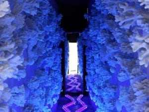 The ways in which humans have mythologised the natural world is explored in detail in the following sequential environment, The Crypt. This work comprises an array of inflatable fabric forms that evoke an architectural representation of the underworld, both in the literal sense of merely being below ground level and in the more mythic and cryptic sense of entering the realm of the dead. By referencing gothic elements and the sorts of crypt spaces which are found in cathedral buildings, Boroson creates the effect of a subterranean, primordial chamber into which we are drawn to contemplate mortality. However, he also draws attention to the ways in which these ideas are human interpretations and imaginary projections on what are, in fact, underground caves and caverns. This piece, which is somewhat ironically situated on a mezzanine floor, combines a sense of the earth’s own architecture with an extensively reimagined mythological environment.