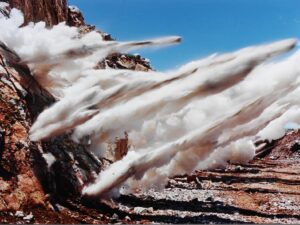 In many of his works, Boroson is in dialogue with the Hudson River School, a group of 19th century artists who produced paintings depicting the Hudson River area and the Adirondacks. Notable artists such as Thomas Cole and Frederic Edwin Church attempted to not only depict the landscape but also, in some senses, to directly transmit the experience and atmosphere of being within the natural world through highly expressive paintings of clouds, rivers and woodland. Their works often took imaginative artistic licence over phenomena, as they saw them, and they frequently used impossible natural effects to create the atmosphere of their paintings. In previous works such as Lucky Storm (2004), for example, Boroson realised cloud formations in nylon; impossible rays of sunlight are seen to pour through them. The works of the Hudson painters often gave the impression of awe at the overwhelming forces of nature. Boroson celebrates and continues to test their ideas, while also turning many of the assumptions underpinned their artistic styles on their heads and also exposing some of the ways in which such works condition our attitudes to the environment. While the paintings of the Hudson River School might suggest a natural world that is expansive, limitless and almost divine, Boroson’s works instead explore the impact of humans on an original environment and the ways in which our representations of such an environment are almost always imaginary, engineered and contrived in some way.