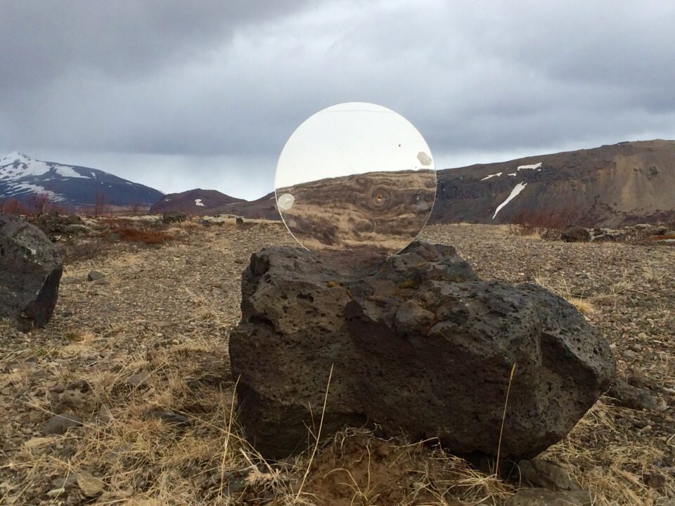 MG: I am presenting a dichotomy, however the Natural and Artificial can be entwined, even indistinguishable, which is the reason for the title Nutri-Artifice. Materials can be saturated to the point we lose track of ingredients, becoming an imitation of a supplement. Nutri implies wholesome, but can be power-bars, diet pills, monosodium glutamate, all escalators or artificial catalysts. Linking Nutri with Artifice implies that trickery or mimesis are presented, but then ramped up until we lose sight of what was natural. My 3D rock series shows reproductions of rocks on isolated backgrounds, transformed into 3D, presenting a virtual artificial reality of a reproduction. With Chrome Sun I wanted to demonstrate the possibility of the aesthetic of artificial objects having potential to seamlessly slot in with the natural environment. A circular acrylic mirror slots into a slot found on a lava rock, perfectly aligning a reflection of a mountain behind the gaze with mountains in front of the mirror.