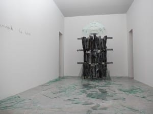 Several of the exhibiting artists, such as William Cordova, take everyday objects, and the implicit meaning in their simple form, and subvert that meaning by re-presenting it within a politicised context. Laberintos (pa’octavio paz y gaspar yanga) (2003-09), a work comprising more than 200 album covers arranged in a maze-like formation, is at first glance quite rudimentary in its appropriation of the album cover. The album covers are significant in their provenance as they were stolen from an (undisclosed) Ivy League college in the United States. We, as viewers, are informed that the museum associated with this college has refused to repatriate an equal number of Incan artefacts from Peru. Cordova, like the museum, has inflicted ownership on the objects, and by doing so highlights the tremendous problem with museum collections consisting of art and artefacts acquired through ignorance or dishonesty. Daderko says: “ Duchamp talked about his distaste for ‘retinal’ art – which he characterised as depending ‘almost exclusively upon the sensitivity of the retina without any auxiliary interpretation.’ This moment of interpretation is where change happens most readily and actively, by making the viewer a crucial part of the artistic equation.” The viewer is asked by some of the exhibiting artists to question the reality that they are presented with as the eye quite easily deceives. Jamie Isenstein’s Straw Fire (with elbow) (2011) questions the authenticity of the readymade by casting a plastic bendable drinking straw in porcelain, fitting it with a wick, and placing it within a glass bottle filled with lamp oil. The straw becomes a candle, though its outward appearance is that of a straw within a bottle: reality is skewed and the viewer must separate the performative action of the straw from its original function. Patrick Killoran’s work operates on a similar course, emphasising objects of consumer society through their reconfiguration. Daderko states: “Killoran re-frames the way we encounter objects and experiences that are initially familiar and modifies them to create a space of discovery.” Glass Outhouse (2002), a two-way mirror portable toilet, is a functional object but a disconcerting one – the patron can see everything that is going on outside whilst they are involved in what is, for most, a very private act. Killoran turns experiences inside out, thereby exposing the cultural and social conventions and mores that underpin them.