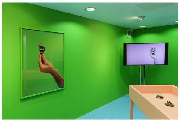 Influenced by his background in linguistics and advertising, Hutchison’s art is concerned with an interrogation of the product and the behaviours and motivation behind capitalist, consumer culture. Working across installation, performance and sculpture, Hutchison creates uncanny and thought provoking situations which subtly distort the commercial process. This latest project, i-, sees the artist commission professional hand models and a commercial photographer to create a traditional shoot with a twist. Instead of the typical consumables and merchandise seen in advertising, Hutchison’s models clutch twisted clay pieces which have been squeezed and moulded around their palms. The immaculately manicured hands are juxtaposed with natural, contorted mud to pose the question of what is desirable to our society. Vibrant photographs from the shoot, bronze casts of the warped mud and a high definition looped trailer featuring the language of advertising make up this seductive yet unsettling exhibition.