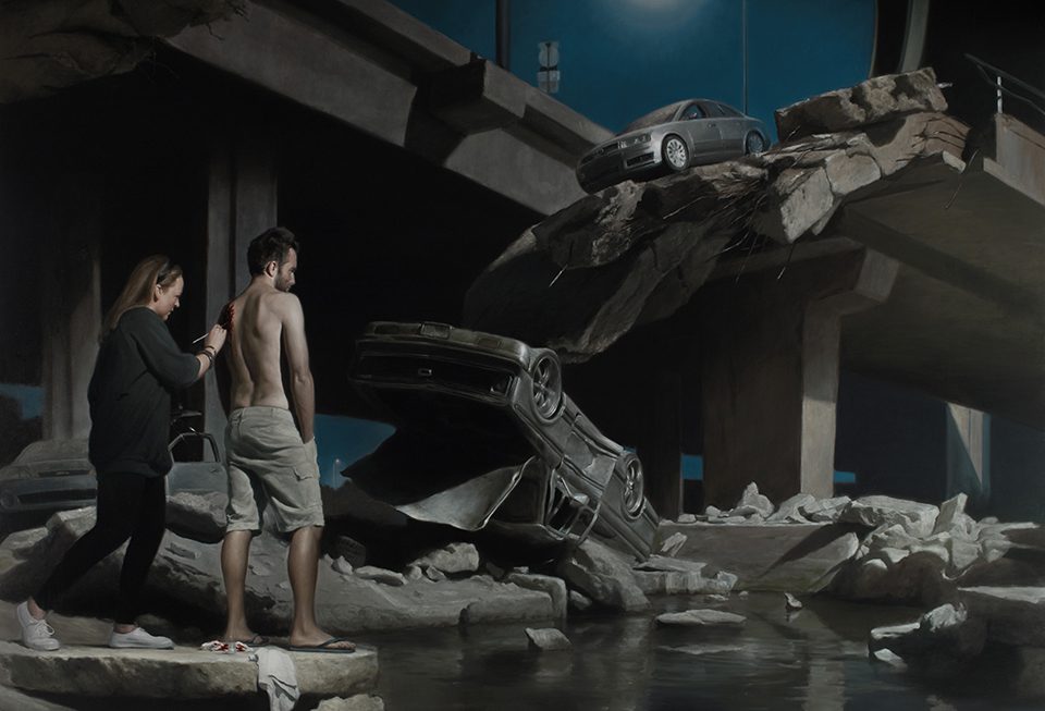 Exhibiting over the last five years, Wateridge has previously shown large-scale paintings depicting, amongst others, posed Sandinistas or a crashed plane in the jungle, both now in the Saatchi Collection. The paintings of Another Place, presented as a sequence, all depict scenes from a fictional American film that is centred on an unseen catastrophic event, thereby inviting the viewer to guess the nature of this particular calamity. One painting shows a wound being painted onto an actor near a collapsed road bridge, giving a clue to the scale of the disaster, but leaving it ambiguous as to whether the scene is a recorded construct or supposed reality. Within each picture there are smaller and more private disasters occurring whose relationship to the bigger, offstage catastrophe is unclear: an architect “dies” on a film set, a security guard falls in a department store at night, an anxious telephone call is received in a domestic kitchen and a woman stands before a house with furniture and possessions heaped around. We have no clear indication if, for example, the last one is about eviction or a garage sale. All of these potential stories happen in and around the greater narrative of Another Place, and each figure portrayed gives clues to further meta-narratives of class and economic status, as well as ideas about the construction and fluidity of identity. All of which, in the absence of any storyline proof, allied with a growing awareness of the artist’s desire to provoke ambiguity in the viewer, soon makes this series of paintings appear far richer than afforded by initial impressions. Another Place, with the constant presence of something bigger beyond each image and hints of a network of interconnected stories, could perhaps be described as a hybrid of Philip-Lorca diCorcia’s A Storybook Life, where images taken over two decades are edited and sequenced to suggest something similar, and Robert Altman’s grand ensemble feature films such as Nashville or Short Cuts.