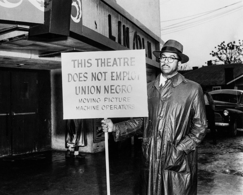 2. Marion Butts, S. R. Tankersley pickets Lincoln Theater for jobs, Dallas, Texas, 1949; from Kinship & Community: Selections from the Texas African American Photography Archive (Aperture, 2026). © 2026 Marion Butts.