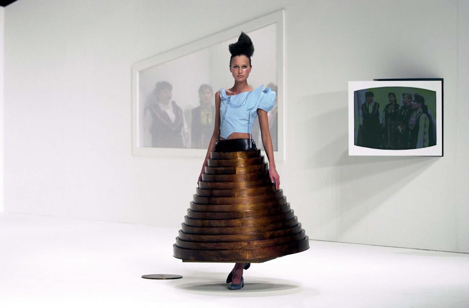Perhaps the best example of this comes from his Afterwords collection, which was first showcased at Sadler’s Wells in 2000. In the exhibition, four chairs surround a table and the chairs are dressed in chair covers. The models approach the furniture and relieve the chairs of their furnishings, turning the chair covers into dresses. The table in the centre is then altered into yet another dress through a series of telescopic pieces that slide upwards when pulled – his notorious “table dress.” Both the models and the fashion pieces directly engage with, and form part of, their surroundings; they are responsible for, and influenced by, their environment. Other designs by Chalayan have taken the idea of construction rather more literally – in 2011 he built an “egg” around Lady Gaga for her to make her entrance at the Grammy Awards in, so that the singer might appear to “hatch” out of it on arrival.