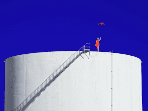 A fascination with the often surreal landscape of present-day America is felt in a series of electrifying photographs. In the titular series, imagined realities are conceptualised by Paradis through sketches and paintings, which perform as blueprints for the staged images. After constructing the corresponding props and costumes, the artist scouts for the perfect location to realise her unique vision. The final result is a collection of vivid scenes which have been infused with a narrative significance, commonly featuring Paradis as the central figure in front of a rich and unnatural Yves Klein blue sky.