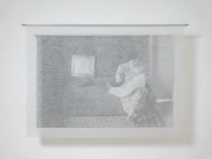 Family relationships recur throughout the work on display, such as Oma’s Kitchen Floor (2008) a wall-mounted section of linoleum, taken from his grandmother’s kitchen. The human traces left by decades of his grandmother’s feet moving across the linoleum and wearing down its pattern are revealed as a picture built up over 40 years through half-a-lifetime of movement. Meanwhile, one of several video works, Mum’s Continuous Note (2013), is both a touching portrait of Beer’s mother and a celebration of sound, as she appears to be singing a single note for three minutes without drawing breath, while creating harmonies on a blue guitar.
