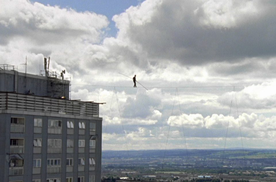 The project is inherently self-aware of its political connotations, however High Wire eschews a direct dialogue with the bleak landscape to focus on human endeavour against hostile circumstances. Parallels are drawn between two denials of physical constraints as Pasquette and the tower blocks refuse to be bound by physics — Red Road’s builders reached further and further into the sky to create improved standards and increased space for society’s poorest, while Pasquette seems to deny to himself the fear and gravity, which could be his undoing, instilling a sense of awe in viewers who witness a true triumph of the mental over the physical. Yass falls short of romanticising Red Road Estate, but does highlight that the attempted walk inadvertently came to instil the community spirit, which had been the aim of the 1960’s planners, “it became a kind of community event, with everyone coming out to watch it.” Furthermore, Red Road’s planned demolition over the next few years ensures that High Wire provides a real chance to immortalise it, and the utopian ideals to which the estates aspired, and also to serve as a recognition of their very failure, with no protest at the demolition to be heard it is clear that, after 45 years, inhabitants still lack a connection to place.