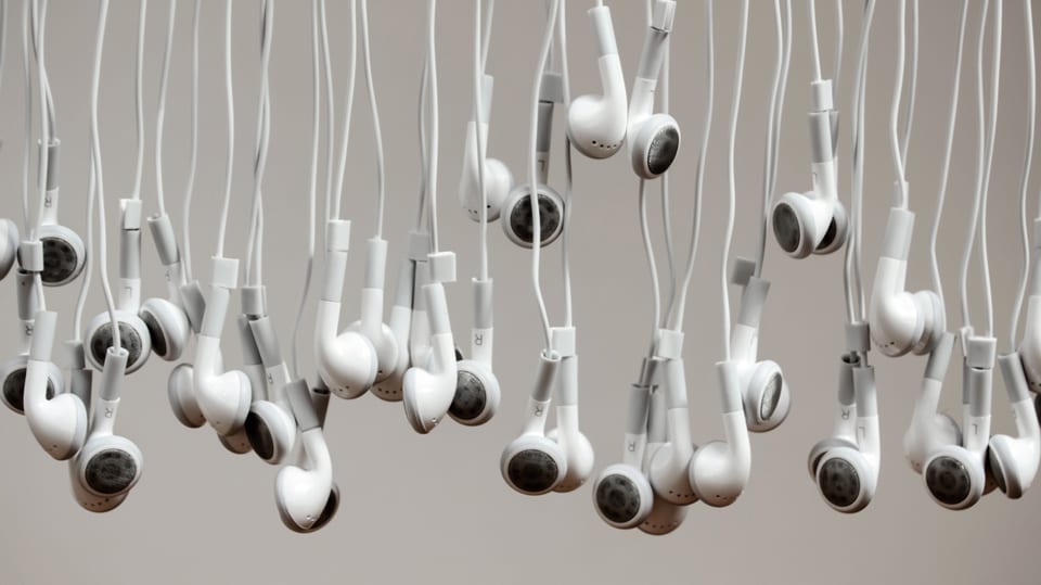 Curtain (white), 2016. Sound installation. 240 pairs white earbuds, acrylic, electronics, 24 channel sound. 300cm x 20cm x 200cm.