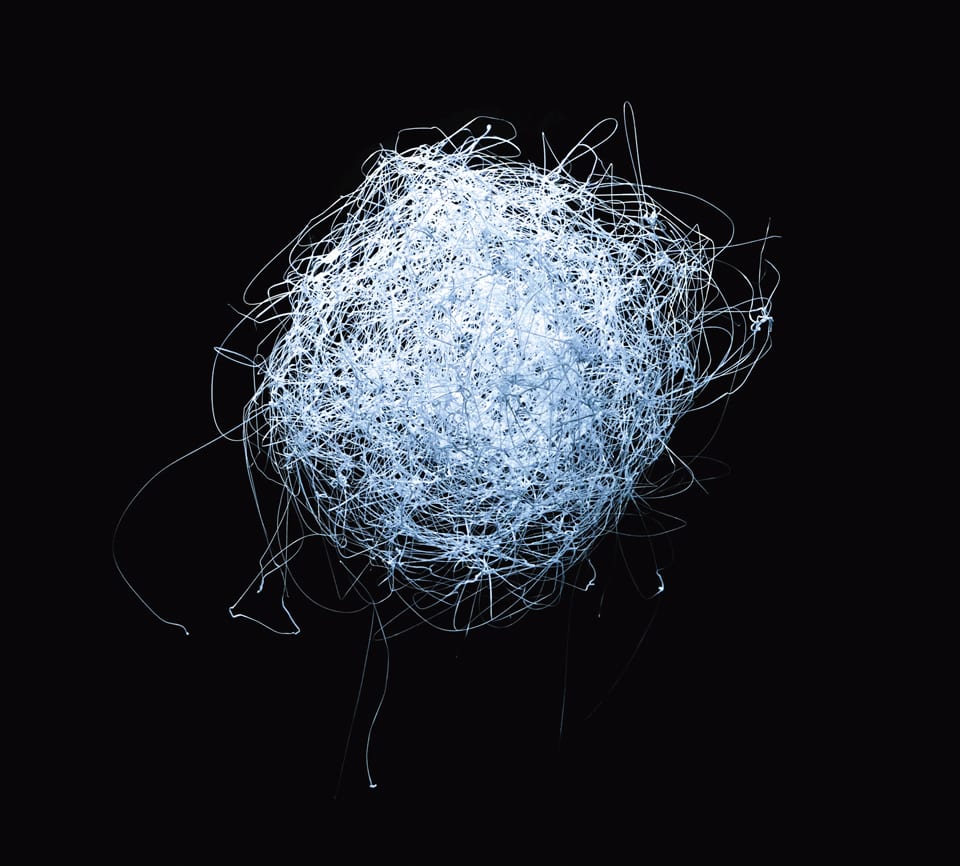 Kaluga works across several media including 3D fibre art, drawing, painting and graphics technology. The Power of Beginning is a three-dimensional sculpture created with ABS plastic filaments, which allowed the artist to draw in space with a 3D printing pen in order to produce a layered structure which interacts with light.