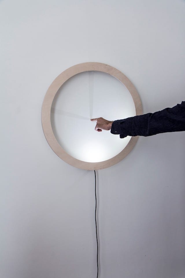 The collective breadedEscalope critically consider art and design as part of modern life. In Shadowplay, they investigate and make use of the physical properties of shadow and of ‘nothingness’. When the viewer engages with and makes contact with what appears just an ambient light on the wall, shadows are cast that function as the hands of a clock.