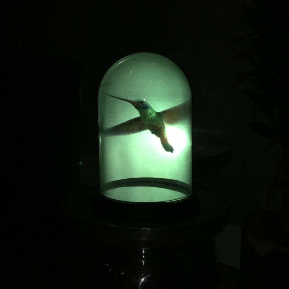 Humming Bird Heart Beat, 2016. Rear projection video clip onto a glass dome. Glass dome 20cm x 30cm, USB stick mini video projector 121cm x 12cm.
