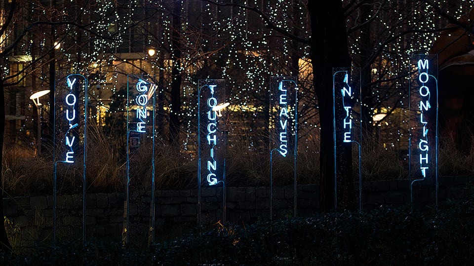 The Garden of Floating Words, 2017. Perspex, neon, paving slabs, 6 stands each 50cm x 50cm at base, 185cm (h) x 25cm (w).