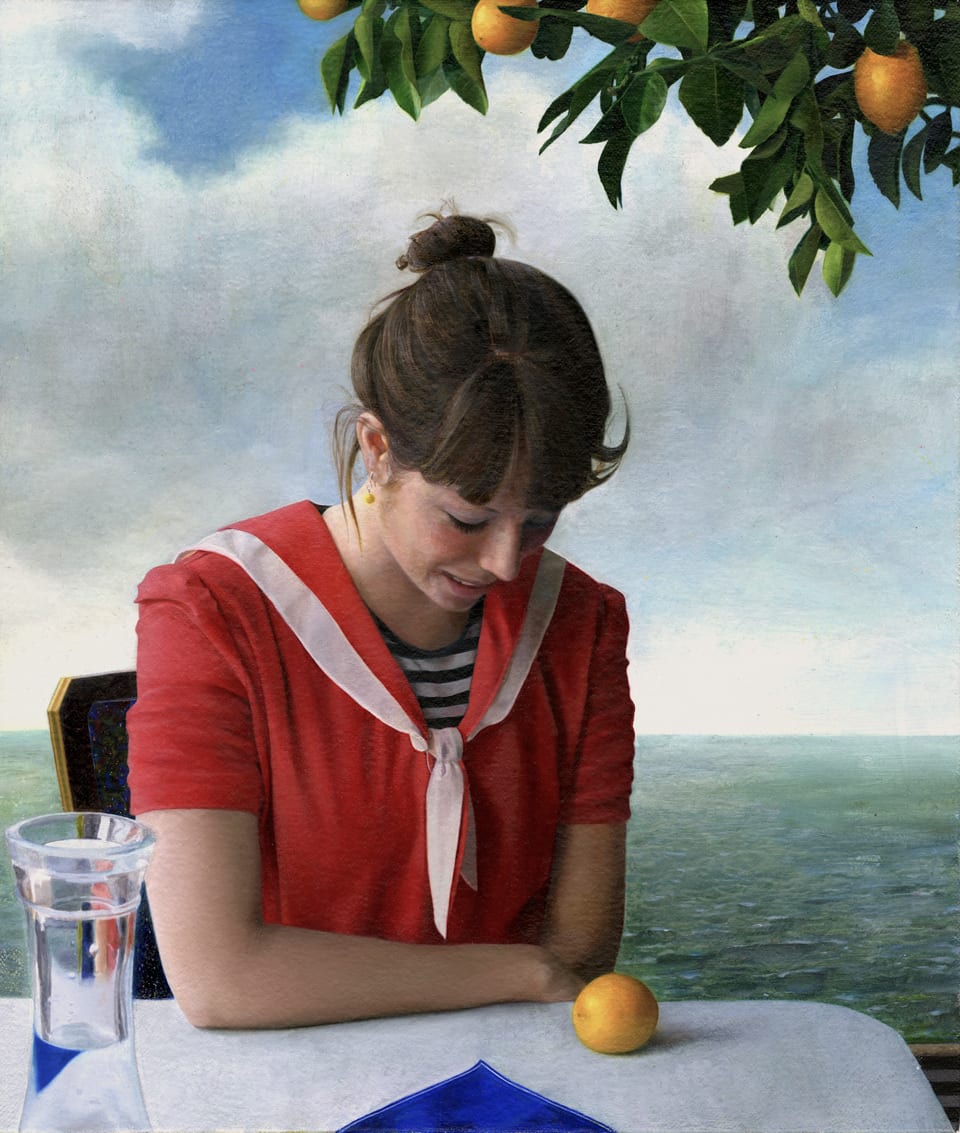 For Sailor Girl II, Cadwallader’s point of departure was an image from a box of salad showing a smartly dressed man transfixed by a cherry tomato. The artist became interested in how this man’s absorbed mental state had been used as a visual metaphor for the freshness and wellbeing promised by the salad.