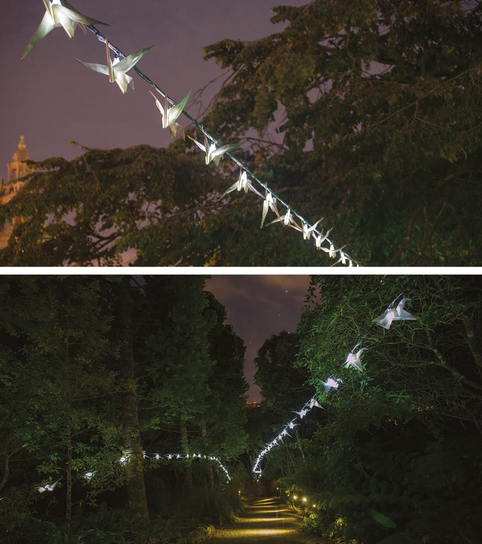Drawing inspiration from behaviours and phenomena found in the natural world, Kathy Hinde aims to share a poetic and reflective experience, enriching the viewer’s appreciation of the everyday. Luminous Birds animates a flock of origami-style birds suspended overhead, which as night falls, the synchronised lighting sequences and music create the sensation of flight.