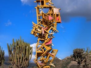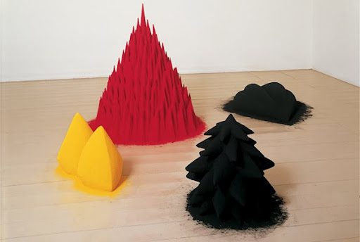 White Sand, Red Millet, Many Flowers is an early example of Kapoor’s interest in creating sculptures out of raw pigment. Four small geometric structures made of powdery pigment are arranged in dialogue with one another on the gallery floor. They look like the tightly-packed piles of dyes and spices you might see in Indian markets, or like bizarre abstract sand castles, which in a sense is what they are: a miniature red mountain, studded with prickly peaks; an angular black tree-like form, jutting out in audacious spikes; two identical yellow bergs or breast-like mounds and an enveloping black wavy trough, almost the shape of pouting lips. As they are constructed from raw-pigment, colour is more than a surface effect; it’s the physical material the sculptures are made of. The work’s strong illusory quality comes from the central paradox that we don’t normally think of colour in terms of its physicality. The sculptures convey a sense of being physical objects and somehow not being at the same time, each one leaving a powdery trace around its base into which it seems they could very quickly dissolve and disappear.