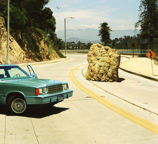 Without exception, all of the images are striking and symbolic, even more so because their titles give them an air of crime-scene photography. 4:01 pm, Sun Valley and Eye #3 (House Fire) (diptych), (2012), is a particularly dramatic example, featuring a house on fire in the middle of a field, the intensity of the flames contrasting starkly with the serene setting. 2 pm, Interstate 10 and Eye #6 (Sinkhole) (diptych), (2012), features a car sinking into a freeway whilst 1:18pm, Silverlake Drive and Eye #2 (Boulder) (diptych) (2012), shows a period car and a huge boulder in the middle of the road. Clearly, for the viewer it is too late to prevent this accident that has occurred – we are present only in the aftermath, compelled to watch but not to act. This is echoed in 11:45 pm, Griffith Park and Eye #4 (Roadside Victim) (diptych), (2012), which is even more graphic in that the accident has clearly only just occurred. A car is featured again in 3:32 pm Coldwater Canyon and Eye #5 (Automobile Accident) (diptych), (2012), as a woman clings perilously and dramatically onto the bumper, suspended mid-air.