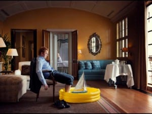 Working with the setting is something the curator clearly felt was important, reflecting very deliberately the Embankment Galleries’ riverfront location by looking at images of water and the city that surrounds it. Water after all is one of the most elusive and notoriously tricky mediums to capture in photography, and it’s wonderful to see the changing relationship of artists not only with the camera but with subjects such as this one. In Susan Derges Eden 4 and 5 (1955) – the texture of water alone becomes the main focus on the camera as the ripples and bubbles are closely examined and scrutinised under the lens. German photographer Floris Neusüss instead produces provocative experiments with double exposure to construct eerie creatures of the underground. Rut Blees Luxumerg (whose photography also makes up the main installation in the courtyard of the house) uses the changing perspectives that the medium of water allows, to capture a new angle to the cityscape through a puddle’s reflection. In the words of Derges water becomes “a visual narrative that also operated as a metaphor for wider cycles of life, death and revival”, something that Barnes takes to heart, seeing the watery images as providing “a metaphor for the richness of the V&A’s collection”.