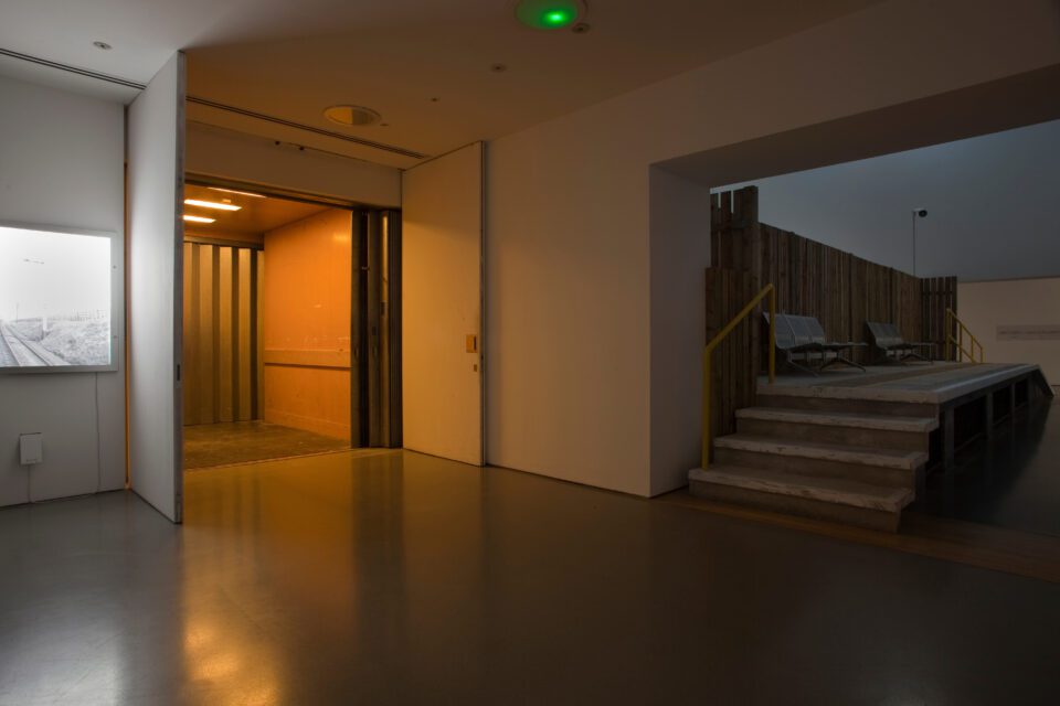 A railway platform bisects the main exhibition space at HMI. Either side of this reminder of the ephemeral in the mundane, the visitor finds the familiar waiting room areas, equipped with floor-affixed, utilitarian chairs. Prior to encountering this example of transition, the visitor encounters illuminated posters of the kind found fixed to the walls of railway stations. The posters themselves comprise photographs of signal points and railway tracks leading to unmarked and uncertain locations. Furthest from the entrance to the galleries at HMI, the visitor finds a heavy goods lift. Every hour and on the hour the doors of the lift are slammed shut and it descends to street level.