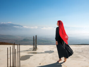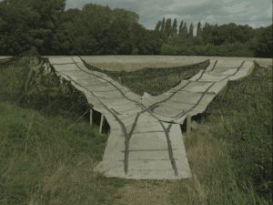 As for our perspective, to watch a lone dancer is candid and intimate, and yet the physical memory their movement lays bare is not clearly legible. There is a formlessness to the moving silhouette, and this formlessness is mirrored by a white curtain covering the gallery’s window and offsetting the formality of the space. A digitally printed slogan on the curtain reads: ‘The wavering of the swarm as a resilient flicker, a gesture towards transformation’.