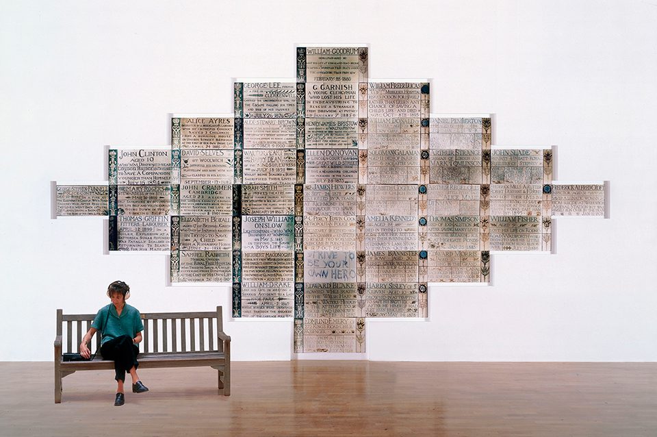 It’s an approach she has returned to throughout her career. Indeed, Hiller has continued collecting the postcards, and new work on show at the Timothy Taylor gallery includes some of her latest work in this series, entitled Rough Seas. Curator, Emma Dexter, explains the role of everyday, underappreciated artefacts in Hiller’s practice as “the taking of things that are so familiar that you haven’t analysed their political nature or how they work sociologically. Through the re-presentation of something familiar, you can see it in a different light.” The sound installation Witness (2000), involves small microphones hung from the ceiling, through which eyewitness accounts of UFO encounters are played in a number of different languages. In spite of the humorously evocative positioning of the microphones as unidentified dangling objects in their own right, the overall effect of the piece is neither mocking nor straightforwardly ironic. This is something Hiller has stressed in interviews about the work, making the point that the phenomenon of UFO sightings is part of our shared consciousness. “All these things are collectively produced and that’s what interests me about it.” The accounts are narrated with heartfelt conviction, and the sheer number and breadth of accounts is compelling. There are hundreds of encounters from many different countries. Witness tests the visitor’s belief-threshold, inviting you to consider the phenomenon for what it is, a widely held and enthralling part of our shared imagination and an adapted, contemporary incarnation of the will to believe in visionary experience.