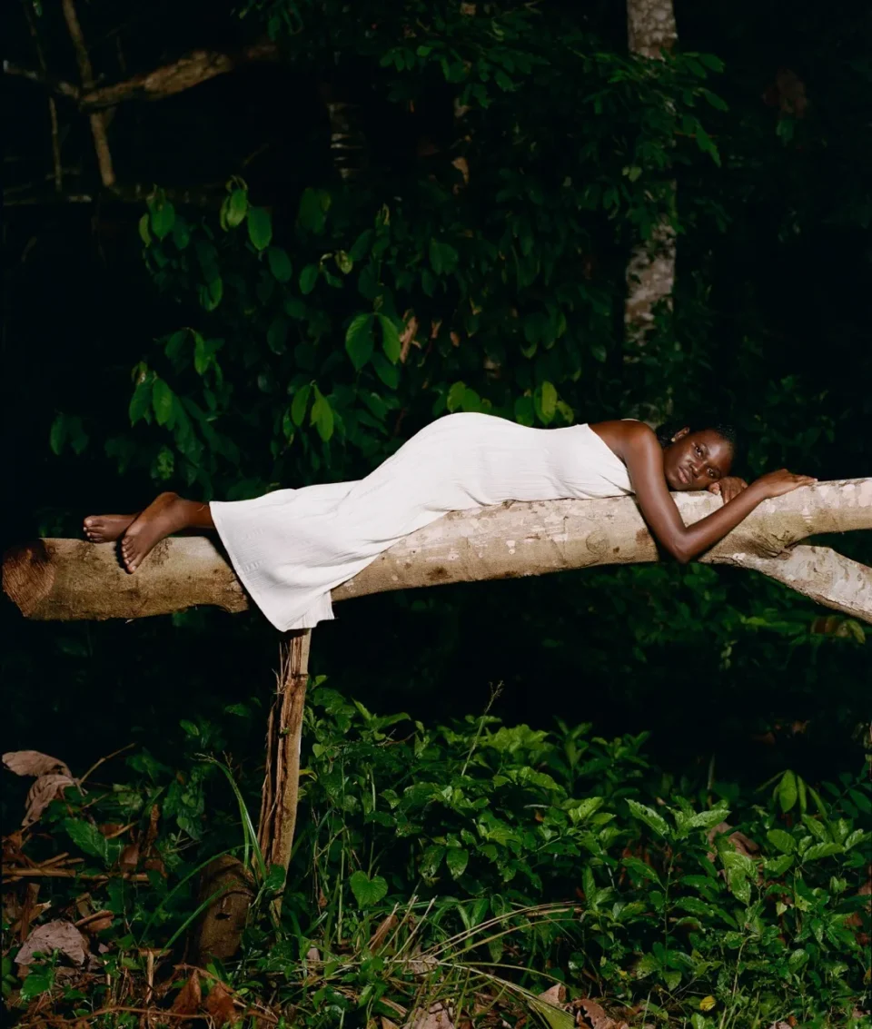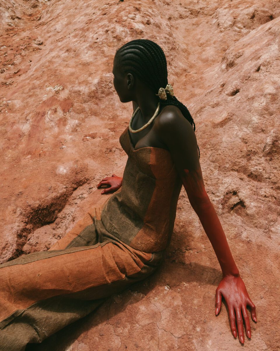 7. IAMISIGO, clay-dyed barkcloth dress, Shadows, Spring/Summer 2024. Photographby Fred Odede. Courtesy of IAMISIGO.