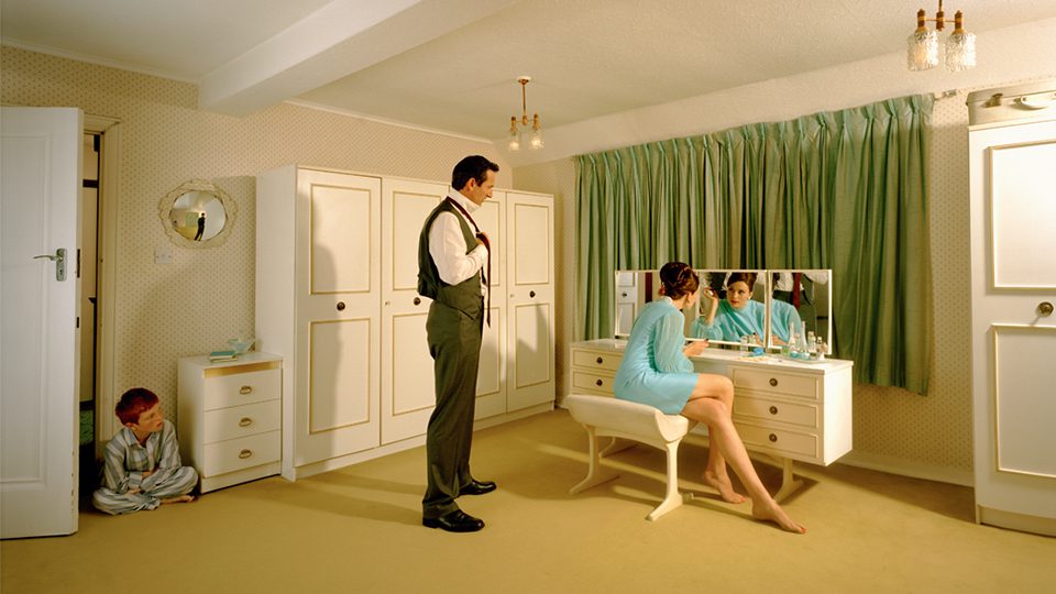 The Blue Bedroom is about the child experiencing / watching the lives of his parents – as children we have access to our parent’s lives, if we’re lucky we share them for many hours of the day, but the adults are experiencing those hours in a very different way to the children. You know that moment, years later, when you realise your parents had been talking about you, or that they must have just had an argument but they pretended they hadn’t? So the child sees his parents getting ready to go out for the evening, he watches from the doorway and we’re not sure if the parents realise he is there. The parents inhabit the adult world where they may be happy and in love, they may be arguing, perhaps she is thinking of leaving – see the suitcase on top of the wardrobe? Years later, the child might suddenly understand what he was witnessing. The inspiration for the image was a intimate statement of my friend Sarah-Jane’s earliest memory of watching her father pick out ties through her bedroom door.