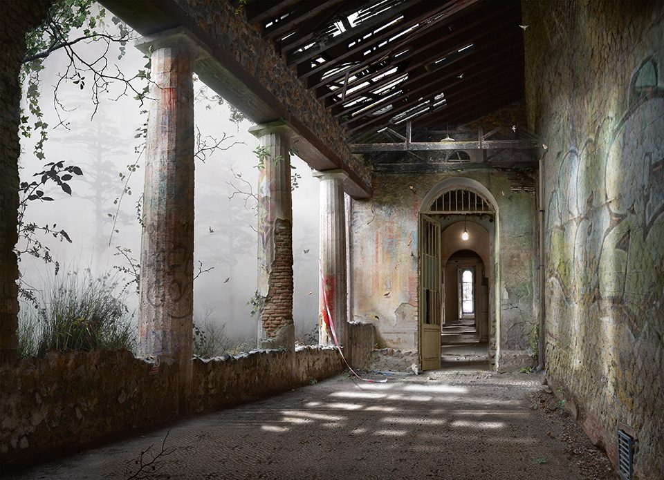Suzanne Moxhay’s (b. 1976) work developed out of an interest in the constructed domain of film, where natural and artificial elements merge to immerse the viewer in a fictional world. Drawing from an archive of collected material that ranges from mid-century books to contemporary, found photographs, she creates narrative photomontages reminiscent of empty sets, uniting the exterior and the interior. Referencing pictorial and filmic conventions, Moxhay reveals the inherently unsettling elements of this appropriated imagery. Spaces that initially appear real begin to break down. The viewer is involved in the construction of these images, which play with anomalies of texture, surface and depth; and scale, movement and architecture. A technique of physical and digital photomontage informed by the early film-making technique of matte painting reprocesses these staged scenes, taking them further from their original context into an uncanny realm. www.suzannemoxhay.com.